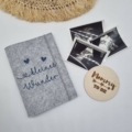 Die hochwertige Hülle wird aus stabilem Filz gefertigt und mit der zarten Stickerei „Kleines Wunder“ sowie kleinen Herzmotiven veredelt. Durch den elastischen Verschluss bleibt alles sicher zusammengehalten – egal ob in der Handtasche, im Rucksack oder in der Wickeltasche.