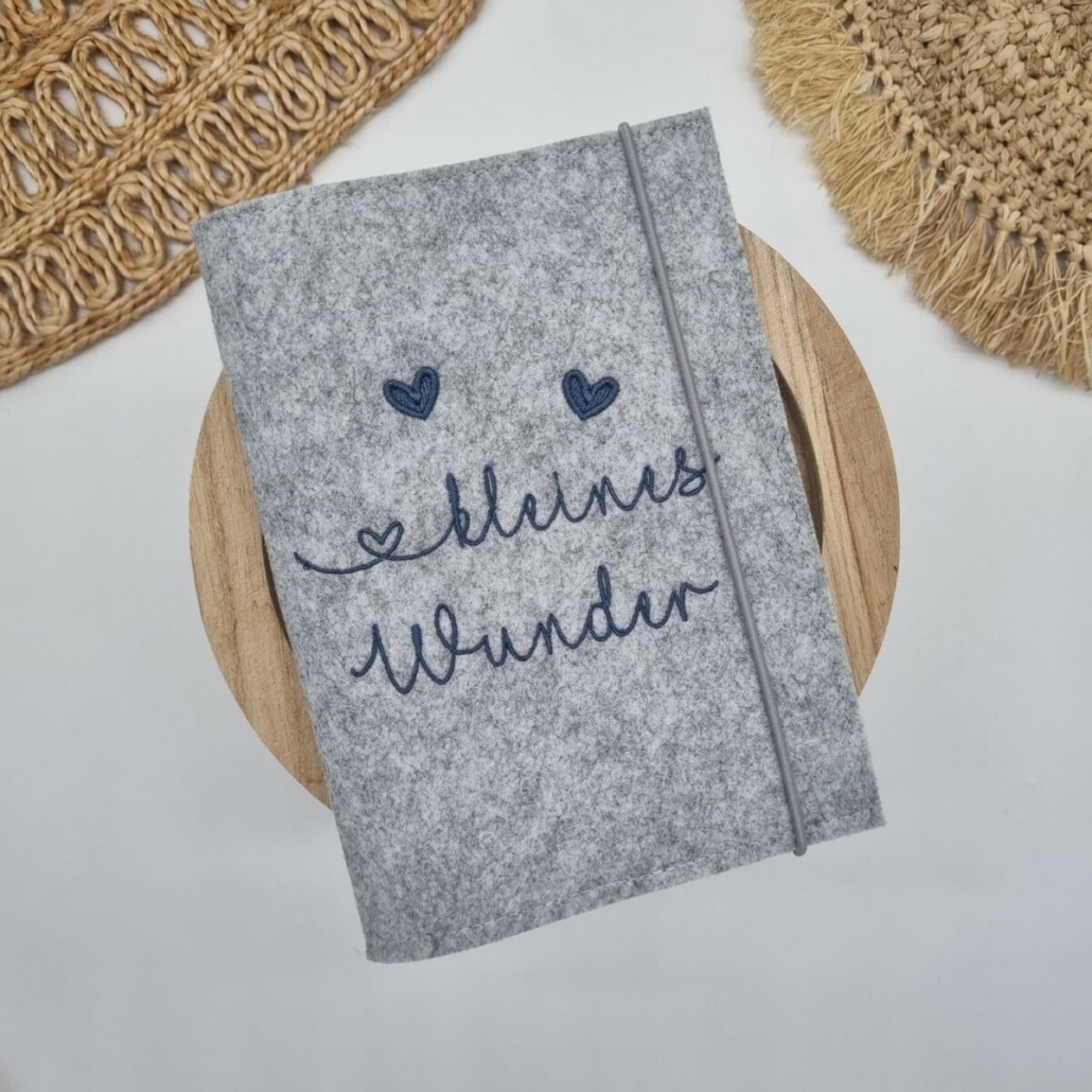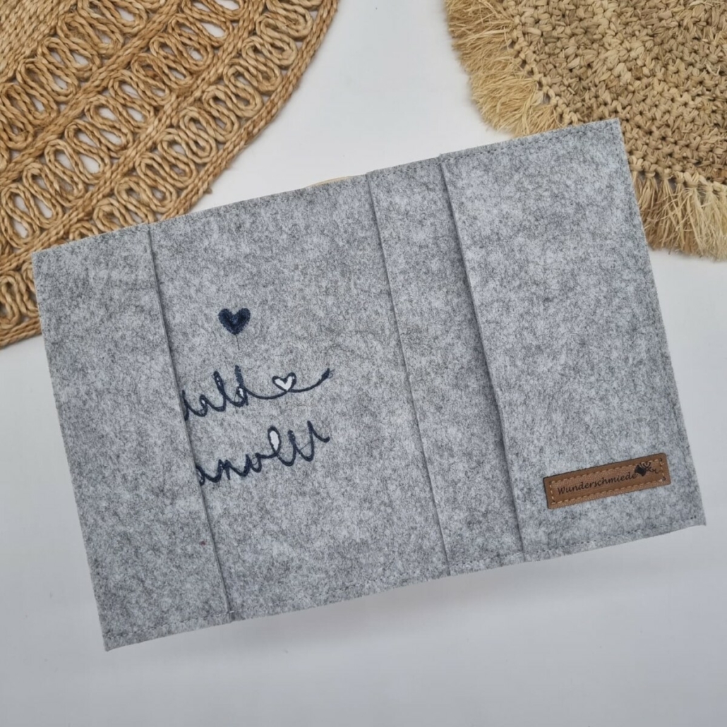 Die hochwertige Hülle wird aus stabilem Filz gefertigt und mit der zarten Stickerei „Kleines Wunder“ sowie kleinen Herzmotiven veredelt. Durch den elastischen Verschluss bleibt alles sicher zusammengehalten – egal ob in der Handtasche, im Rucksack oder in der Wickeltasche.