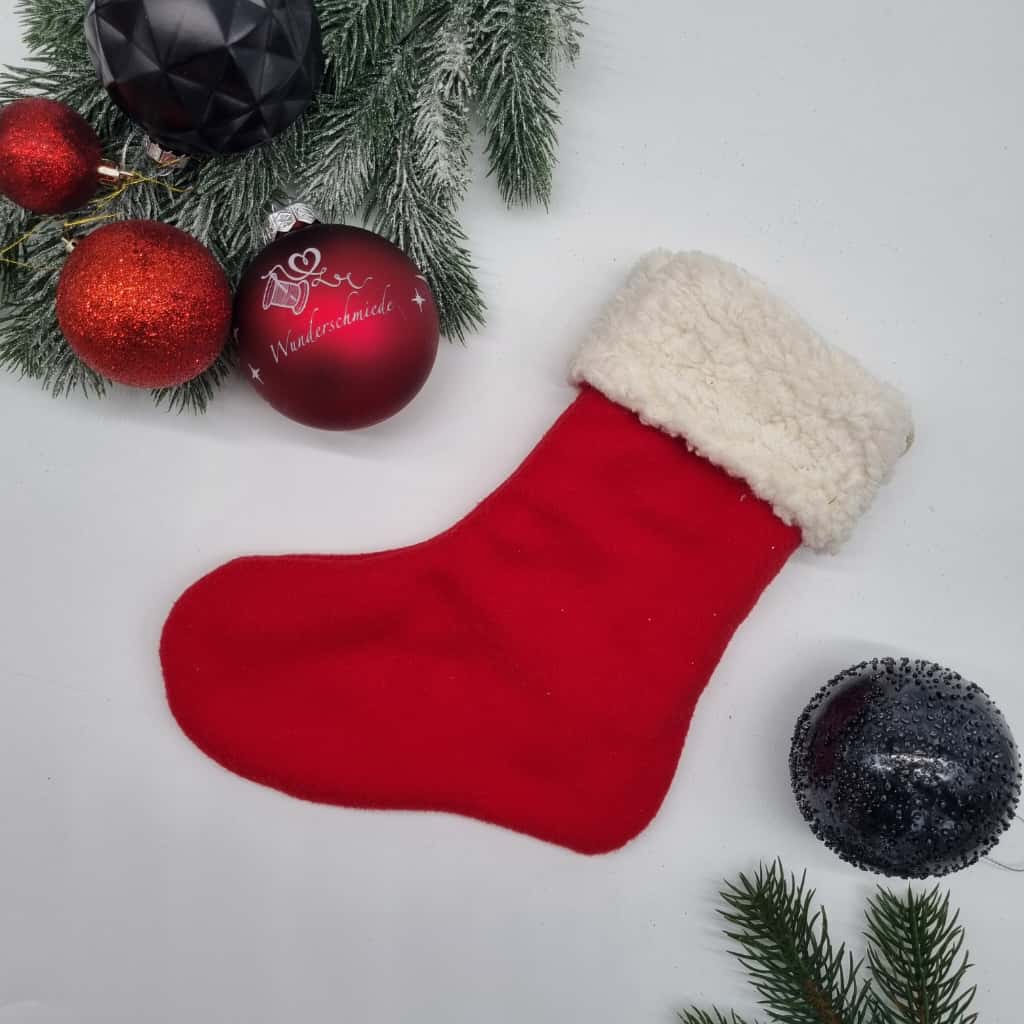 Unser liebevoll gefertigter Nikolausstiefel aus kräftig rotem Fleece und kuscheligem, ecrufarbenem Teddyplüsch am Schaft bringt festliche Wärme in jede Weihnachtszeit. Auf Wunsch wird der Stiefel mit einem Namen in edlem Gold oder klassischem Schwarz personalisiert – ideal als individuelles Geschenk oder besondere Dekoration. Maße: ca. 30 × 14 × 23 cm.