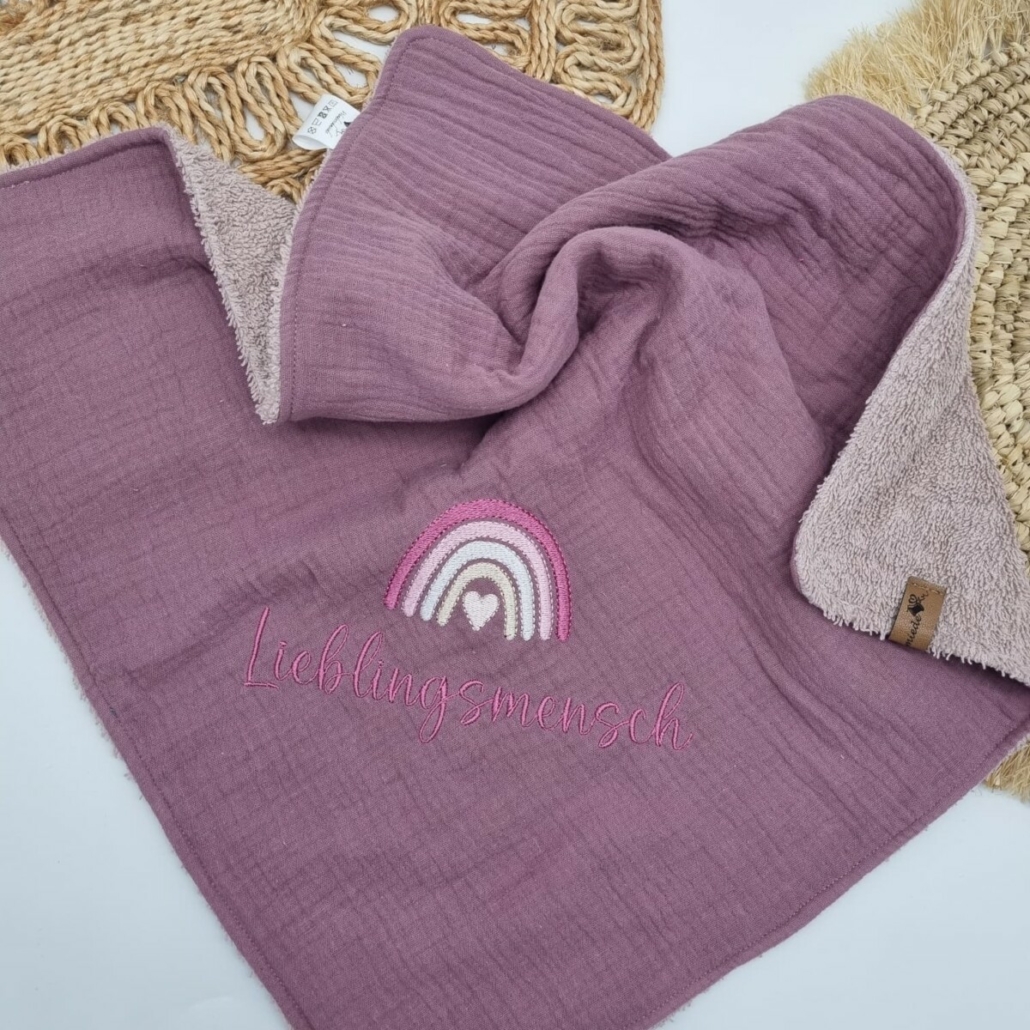 Unser handgenähtes Tuch aus Musselin und Frottee ist ein vielseitiger Begleiter für Deinen Alltag mit Baby. Die weiche Musselin-Seite ist mit einem zarten Regenbogen bestickt, darunter der Schriftzug „Lieblingsmensch“ – ein liebevolles Detail, das das Tuch zu etwas ganz Besonderem macht.